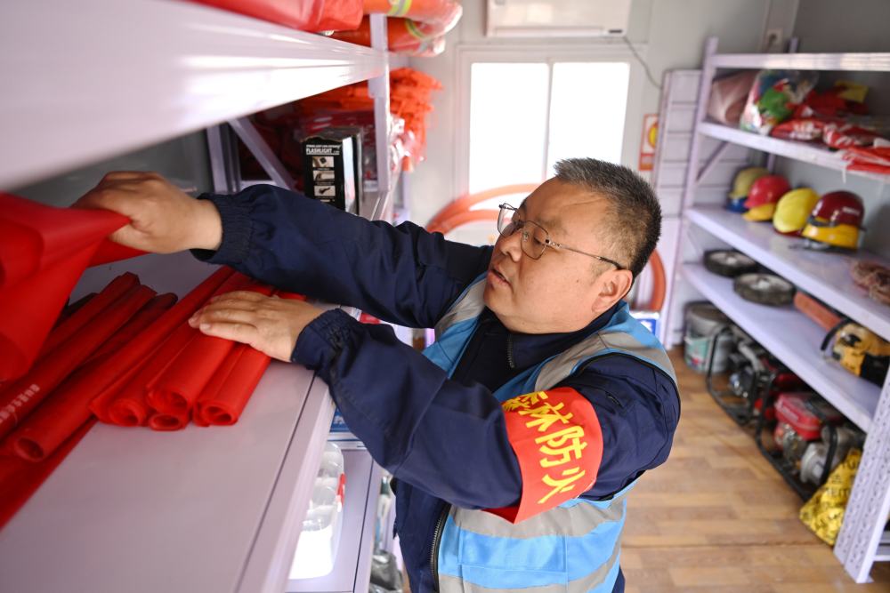 ↑3月19日,刘世光在雄安新区“千年秀林”雄中片区防火检查站整理物资。新华社记者朱旭东 摄