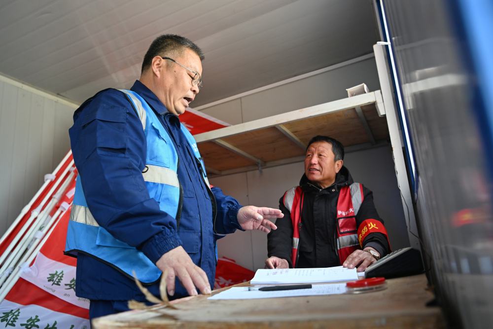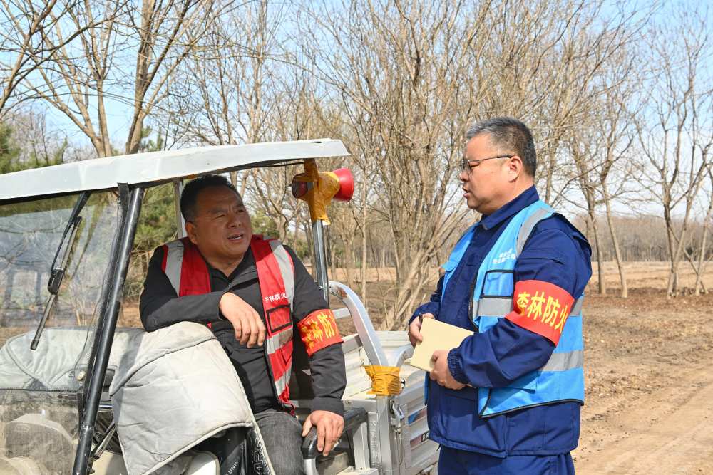 ↑3月19日,刘世光(左)在雄安新区“千年秀林”雄中片区防火检查站与护林网格员交流。新华社记者朱旭东 摄