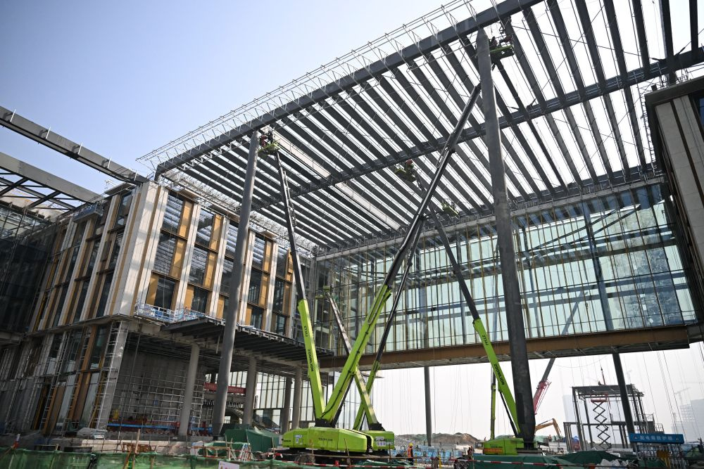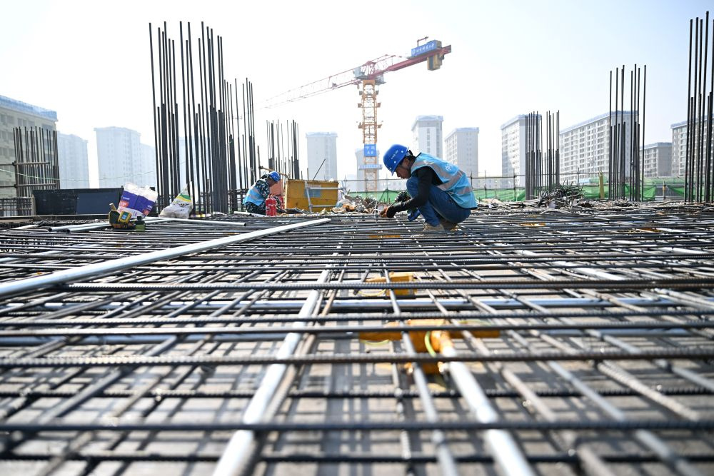 ↑3月25日,中建三局工人在中国矿产资源集团有限公司雄安总部项目建设现场施工。