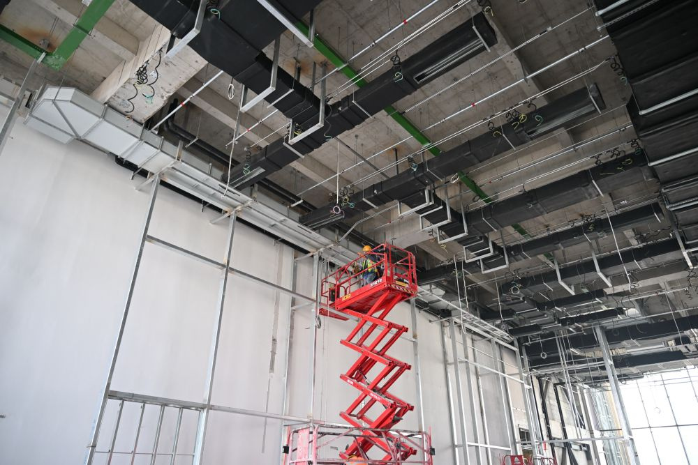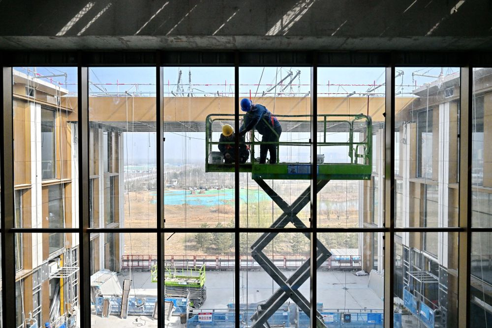 ↑3月25日,中建二局工人在北京科技大学雄安校区建设现场施工。