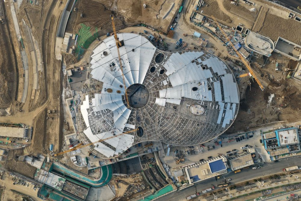 ↑雄安新区城市文化广场建设现场(3月25日摄,无人机照片)。
