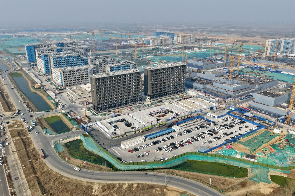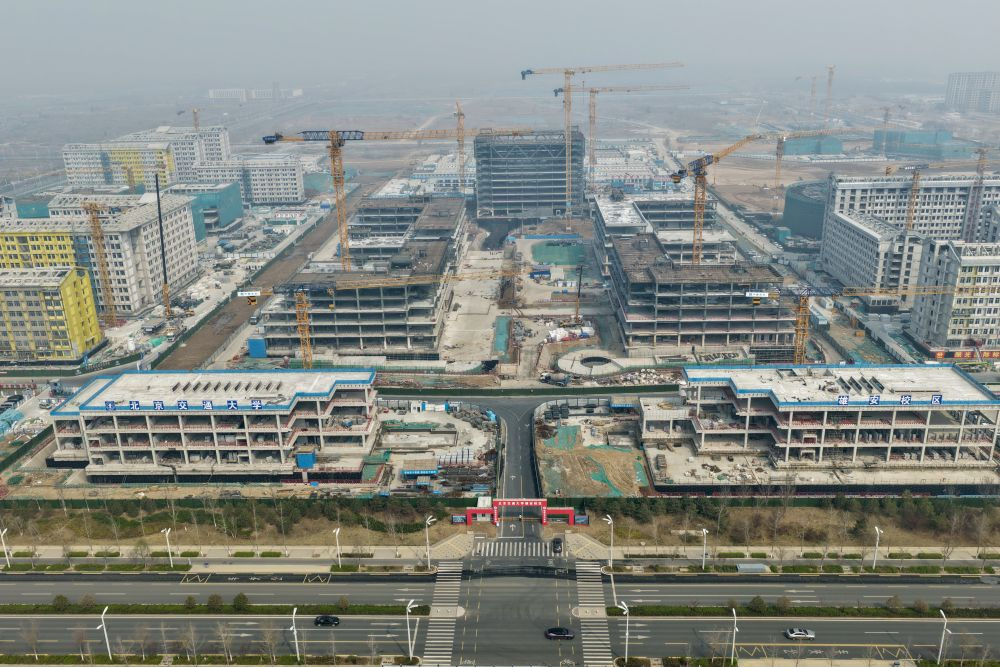 ↑北京科技大学雄安校区建设现场(3月25日摄,无人机照片)。
