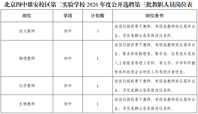 附件:北京四中雄安校区第二实验学校2026年度公开选聘第三批教职人员岗位表