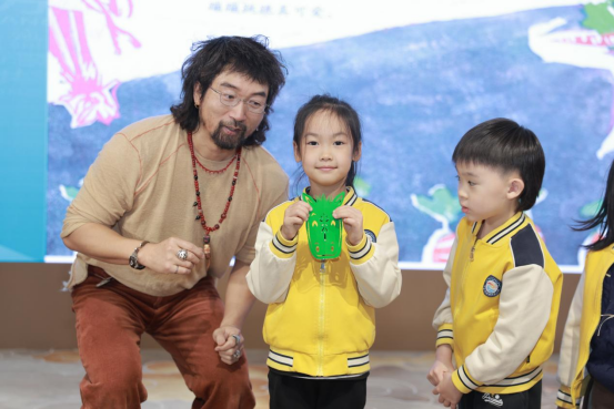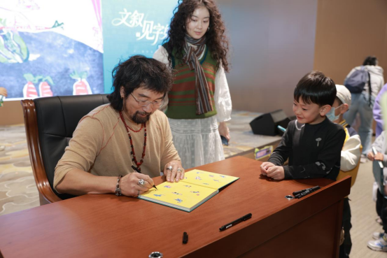 互动环节氛围热闹,熊亮邀请小朋友们登台吟唱经典童谣,稚嫩童声与温柔旋律交织,现场充满欢声笑语,活动氛围达到高潮。为感谢孩子们的积极参与,熊亮现场亲手创作剪纸作品,赠予每一位勇敢登台的小读者。随后的签绘环节,他为读者写下寄语。