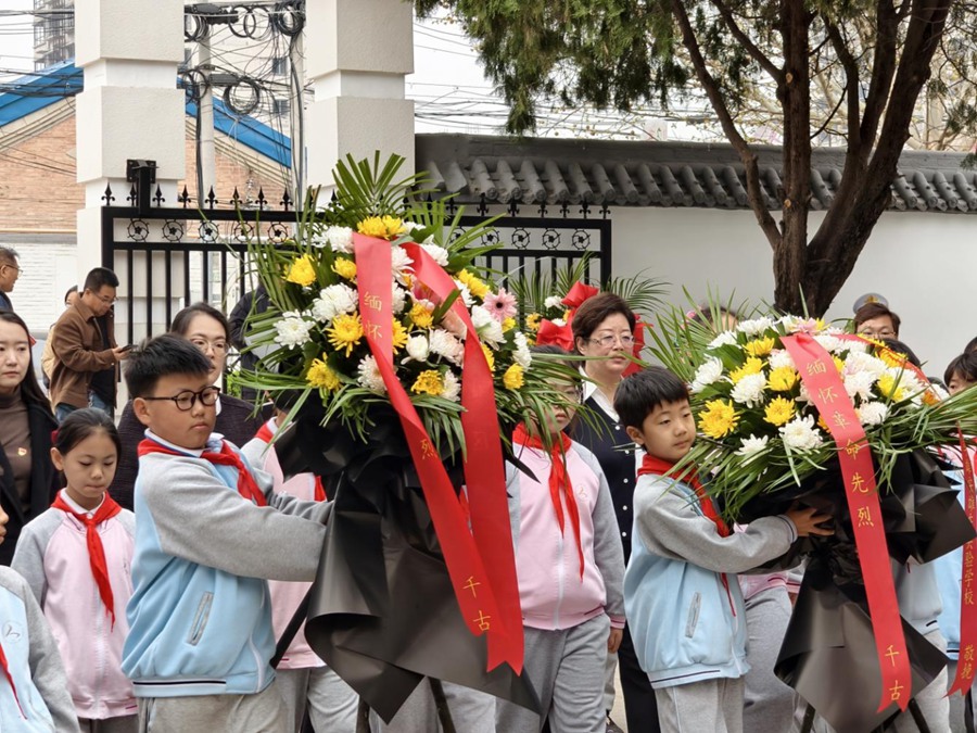 伴随着少先队员的歌声,祭奠仪式正式拉开帷幕。社区及学校相关负责人向革命烈士纪念碑敬献花篮,随后,全体人员肃立默哀,向为民族独立和人民解放事业英勇献身的先烈表达最深切的哀思。