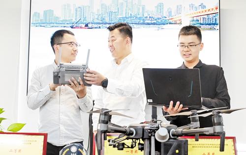 4月3日,雄安新区中关村科技园,雄安佰筑信息科技有限公司创始人张怀战(中)与技术人员一起探讨项目中的无人机巡检路线方案。记者刘光昱 摄