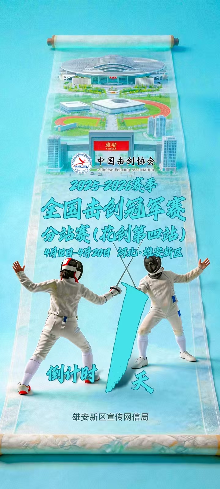4月18日至20日,2025-2026赛季全国击剑冠军赛花剑第四站比赛将在雄安体育中心举行。本次比赛由中国击剑协会主办,雄安新区宣传网信局承办,河北省体育局自行车运动中心协办,设青年组、成年组男、女个人及团体共6个小项,将有来自全国各地的近400名运动员参赛,进行528项次个人赛和42项次团体赛的争夺。