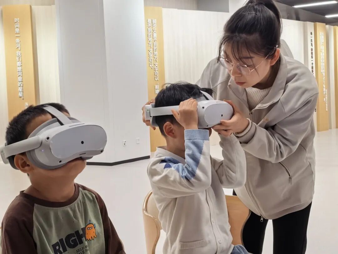 在元宇宙阅读空间,孩子们通过巨幕观看白洋淀互动绘本,如临其境;随后参观诗词展,感受传统文化韵味。在透明玻璃还书处,幼儿现场观摩图书自动分类全过程,直观了解智能管理。此外,8名幼儿在数字互动区体验VR设备,“走进”故事角色。