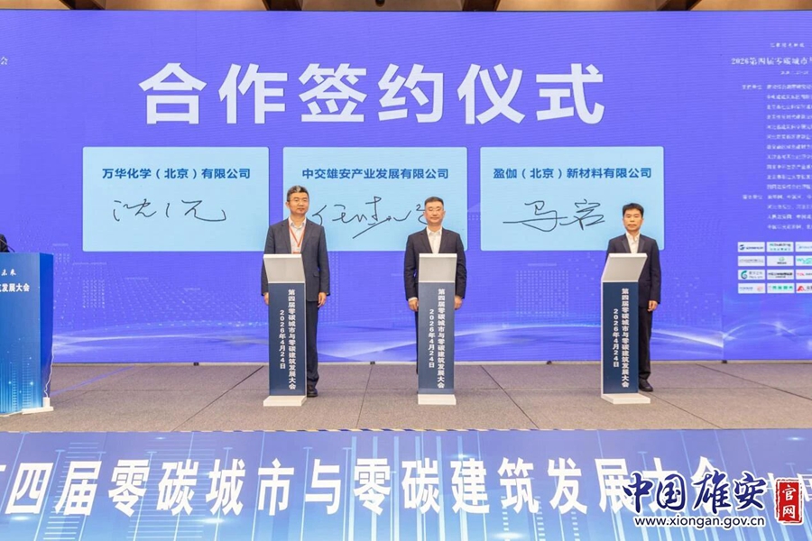 万华化学(北京)有限公司、中交雄安产业发展有限公司、盈伽(北京)新材料有限公司举行合作签约仪式。中国雄安官网牛思佳 摄