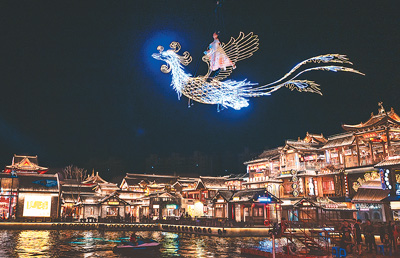 夜幕降临,河头老街灯火璀璨,游人如织。身穿唐装的舞者乘着“凤凰”,翩翩起舞,这是“凤凰飞天”表演,吸引众多游客观赏拍照。