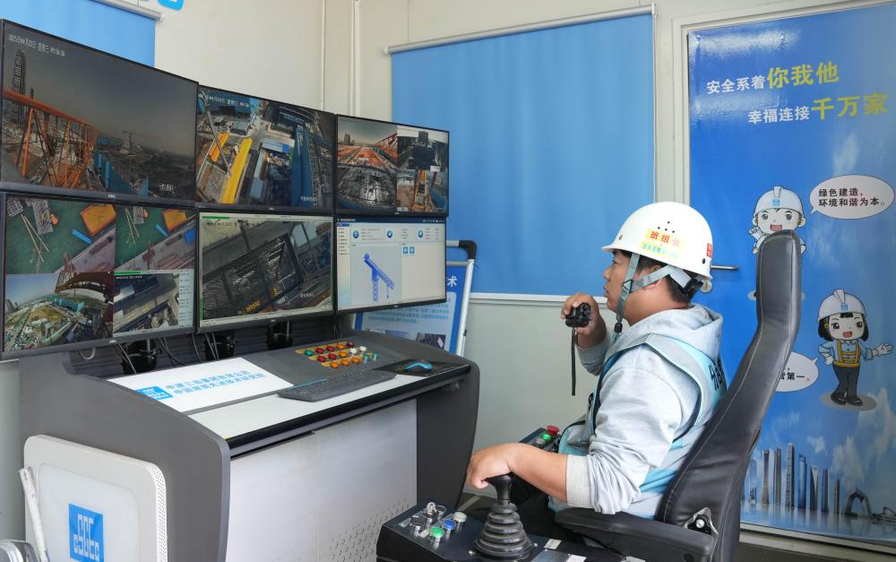 4月23日,在中国矿产雄安总部项目建设工地,塔吊司机在数字全景塔机集控驾驶舱内进行吊装作业。新华社记者落飞麟 摄