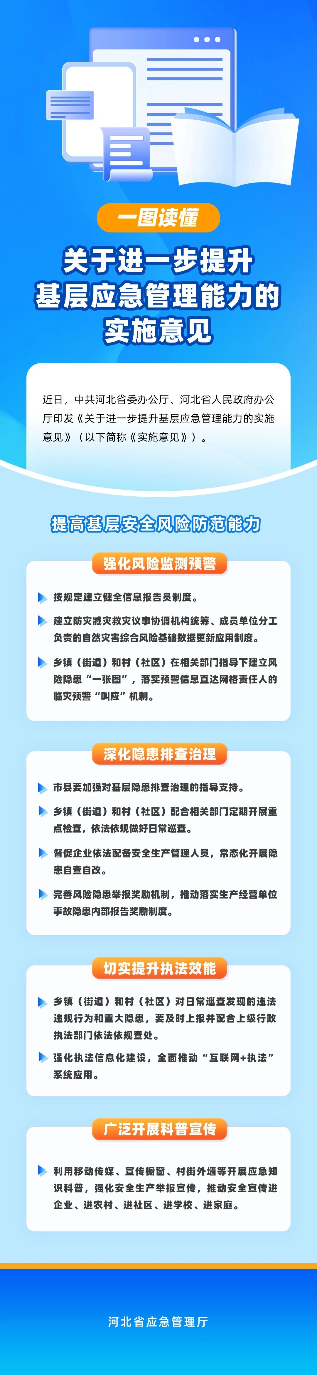 近日,中共河北省委办公厅、河北省人民政府办公厅印发《关于进一步提升基层应急管理能力的实施意见》(以下简称《实施意见》)。《实施意见》提出了哪些工作任务和实施举措?一起看图来了解。