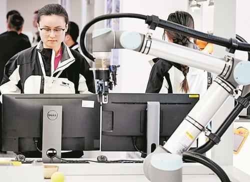 梅卡曼德机器人科技有限公司办公区,工作人员演示“AI+机器人”新产品。刘光昱 摄