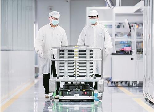 在雄安百信信息科技有限公司智能制造车间内,AGV智能搬运机器人正在按照设定路线自动运送工装板。 李畅 摄