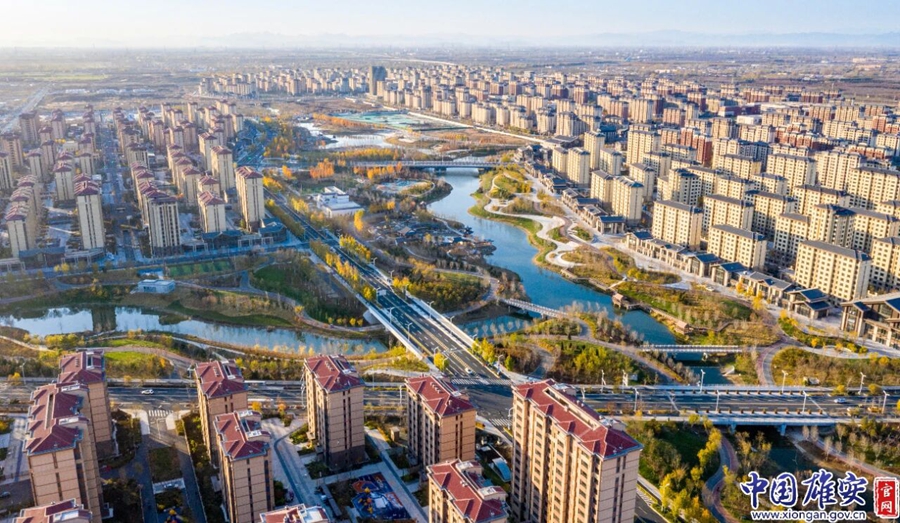 航拍初冬时节的启动区,生态美景与远处建筑交相辉映。中国雄安官网牛思佳 摄