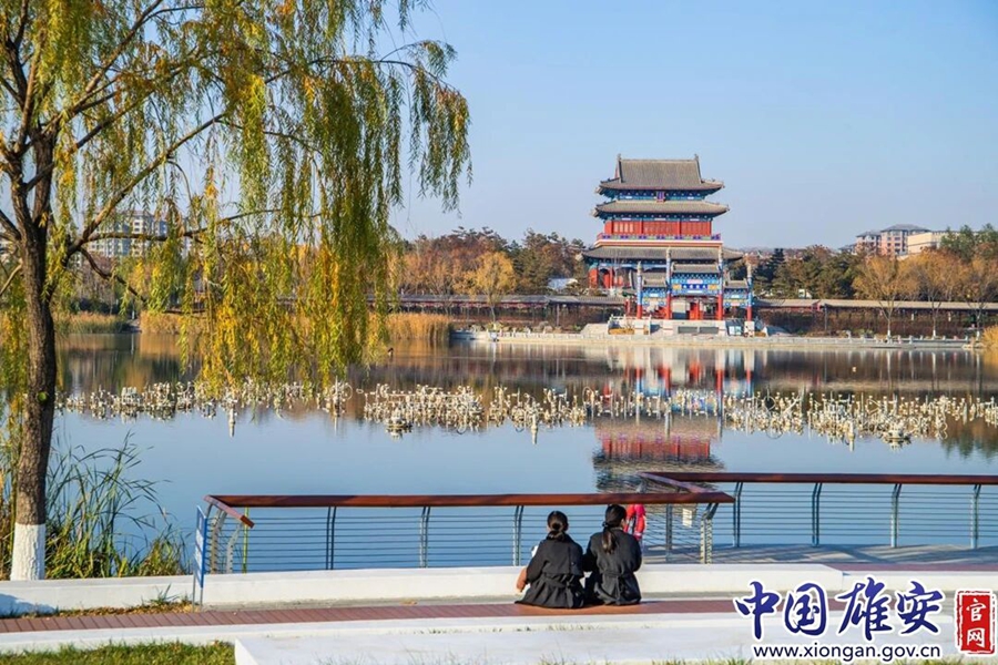 初冬时节的金湖公园,游客欣赏园内美景。中国雄安官网发
