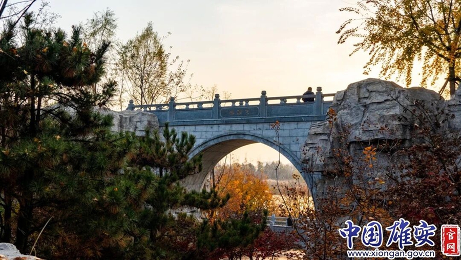 初冬时节的悦容公园,游客在石拱桥上休憩观赏。中国雄安官网高盟 摄