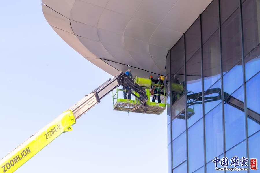 在雄安新区东西轴线项目明珠驿站建设现场,建设者正在进行作业。中国雄安官网李鑫 摄