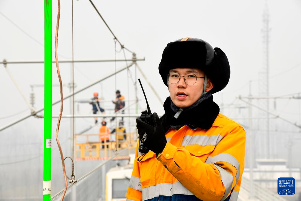 2月1日,在雄商高铁山东菏泽段,中国铁路济南局集团有限公司济南供电段的工作人员通过对讲机沟通作业事宜。