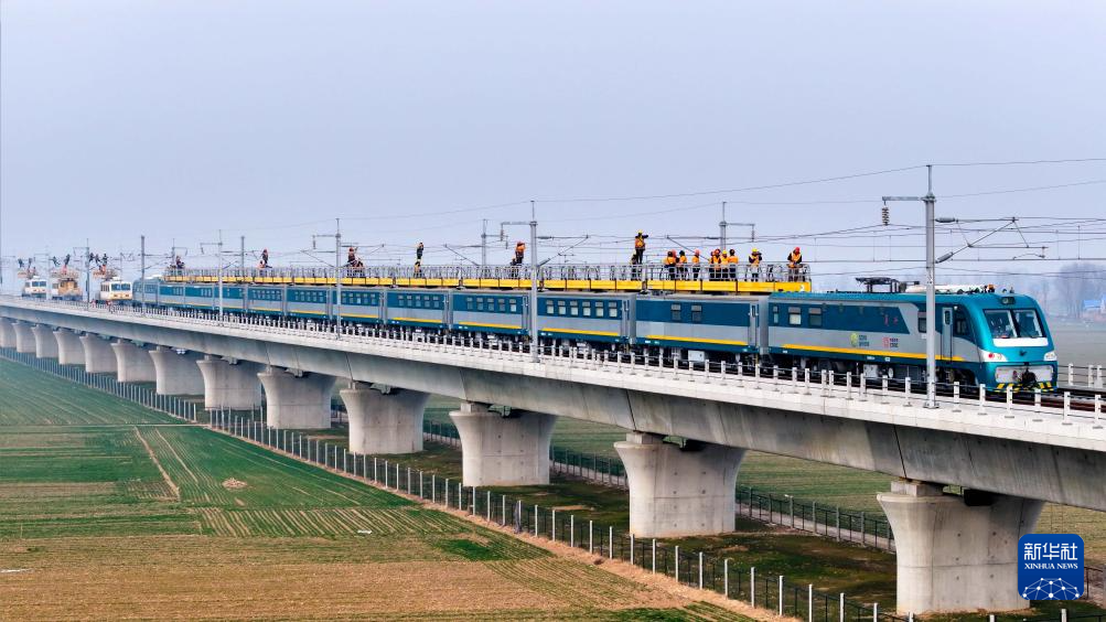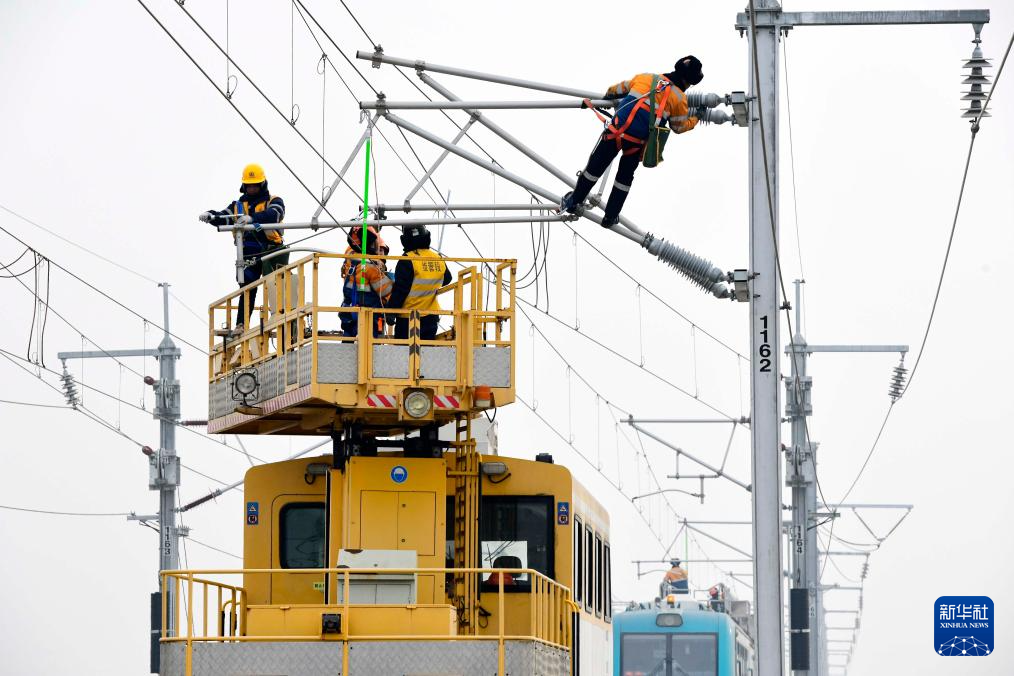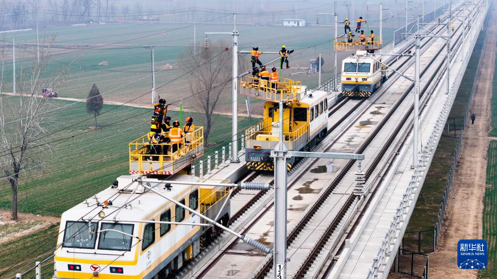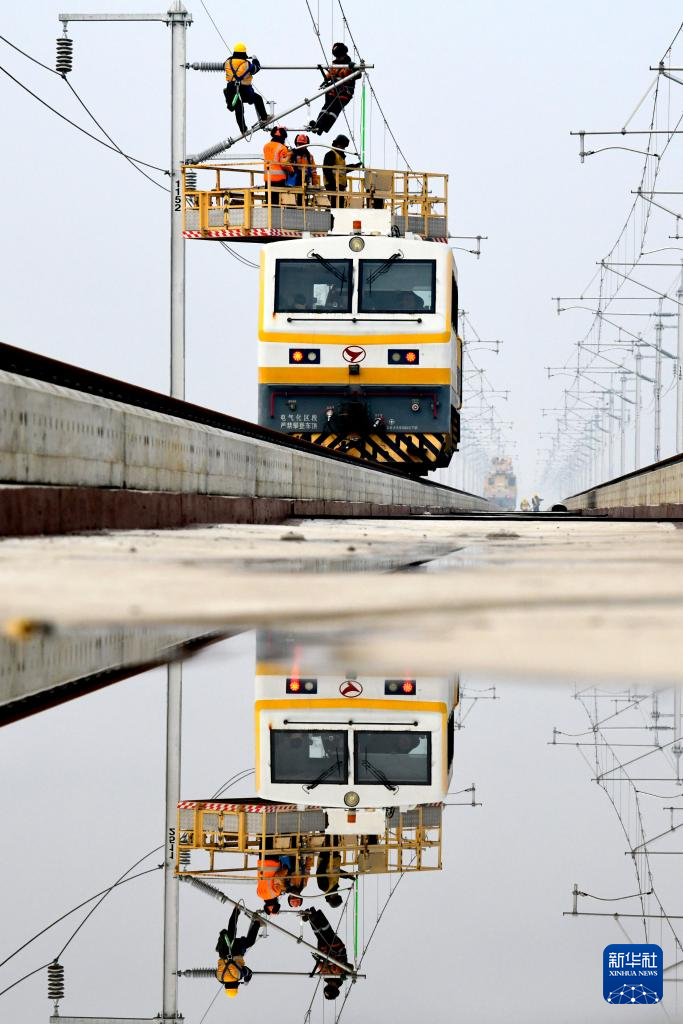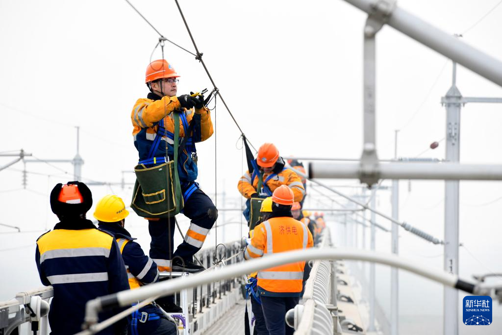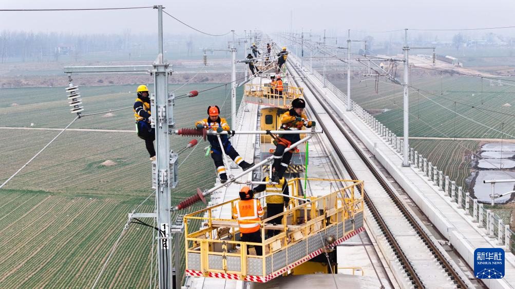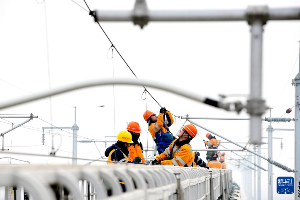 2月1日,在雄商高铁山东菏泽段,中国铁路济南局集团有限公司济南供电段的工作人员对接触网设备进行检查验收。
