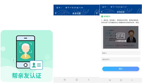 (2)帮亲友认证:点击养老待遇资格认证下方的“帮亲友认证”进入亲友列表。点击右上角的“+”可新增亲友,可手动输入姓名、身份证号,也可扫描身份证自动录入,点击确认,即可新增亲友。