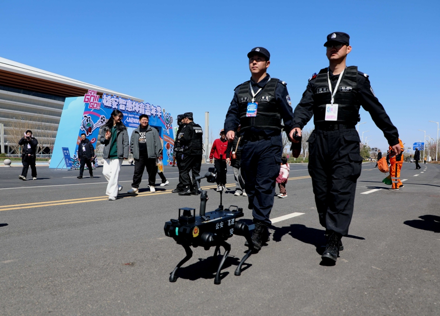 在首届雄安国际女篮邀请赛、雄安马拉松等大型赛事活动现场,警用无人机空中巡查、实时传图、语音疏导,无人巡逻车与机器狗协同穿梭,凭借智能化分析排查风险隐患,形成“空中+地面”的硬核安保矩阵。