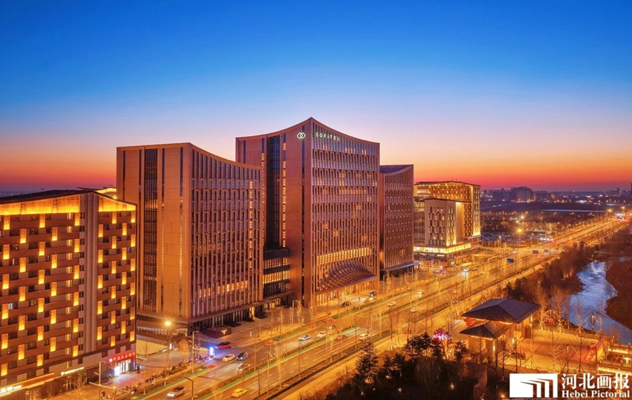 灯火勾勒出这座“未来之城”最动人的轮廓。雄安首个标志性城市建筑群——雄安商务服务中心,在夜色中尽显庄重大气。灯光顺着朱红墙体与灰色飞檐缓缓流淌,将“中西合璧、以中为主、古今交融”的建筑风骨,展现得淋漓尽致。