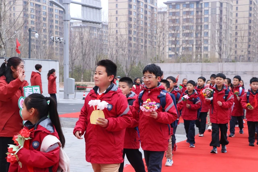 雄安容和金源小学开展“花启新程 让春天发生”春季迎新仪式,用鲜花与微笑迎接同学们归来。雄安容和金源小学供图